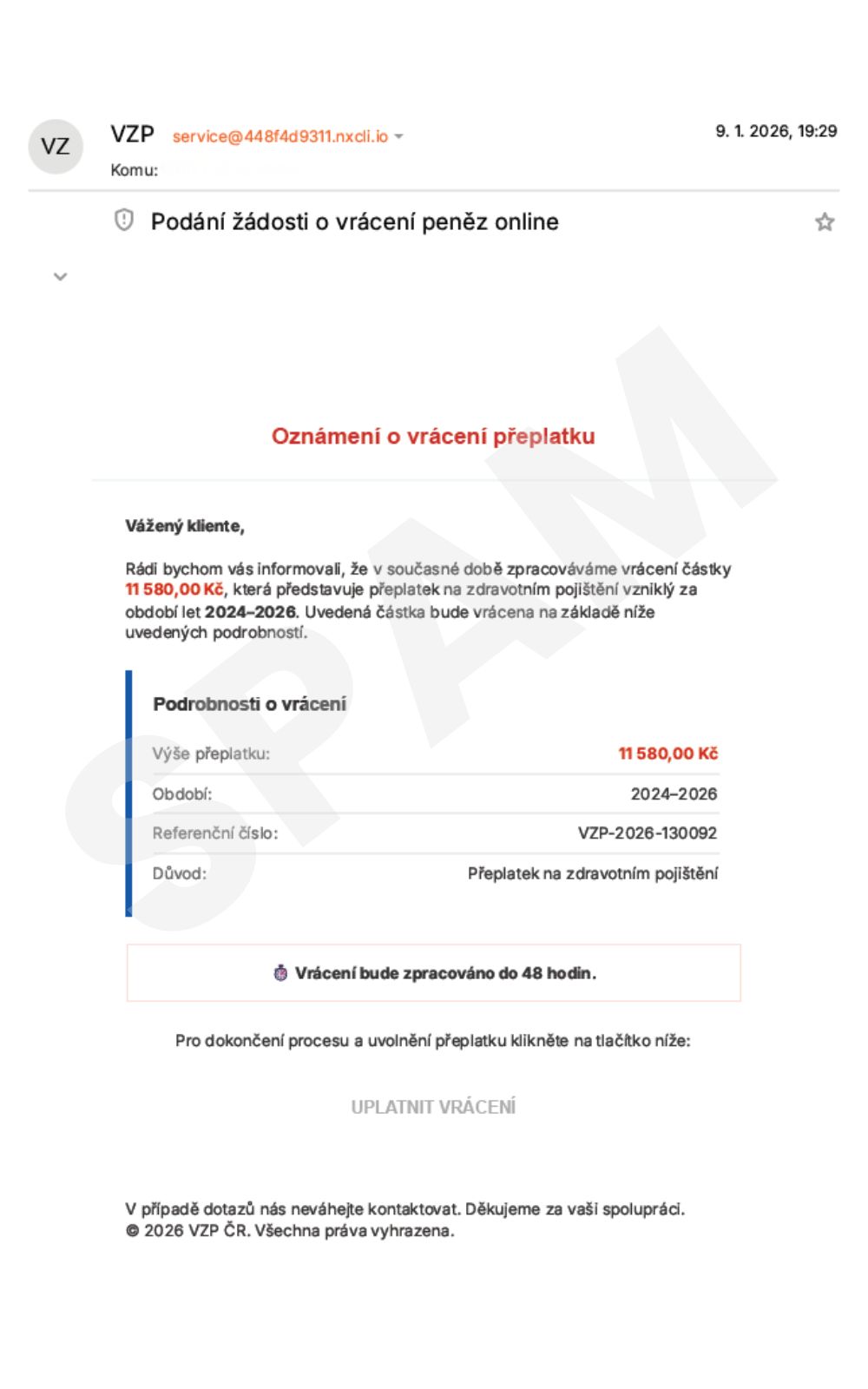 Jedná se o pokus o podvodné jednání (phishing).