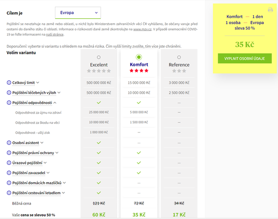 Nejvyšší limity: 500 milionů Kč na léčebné výlohy, 25 milionů Kč na odpovědnost.